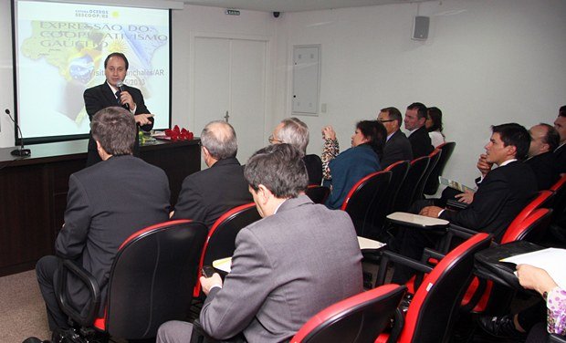 As autoridades foram recepcionadas com um café da manhã e depois se dirigiram para o auditório da Escoop, onde assistiram a uma apresentação do presidente do Sistema Ocergs-Sescoop/RS, Vergilio Perius, que destacou a importância do trabalho desenvolvido dentro do cooperativismo gaúcho e o crescimento do sistema dentro do PIB estadual. Após o discurso do presidente Vergilio Perius, o diretor-geral da Escoop falou sobre a faculdade e o trabalho desenvolvido na formação de profissionais para a área de gestão de cooperativas.