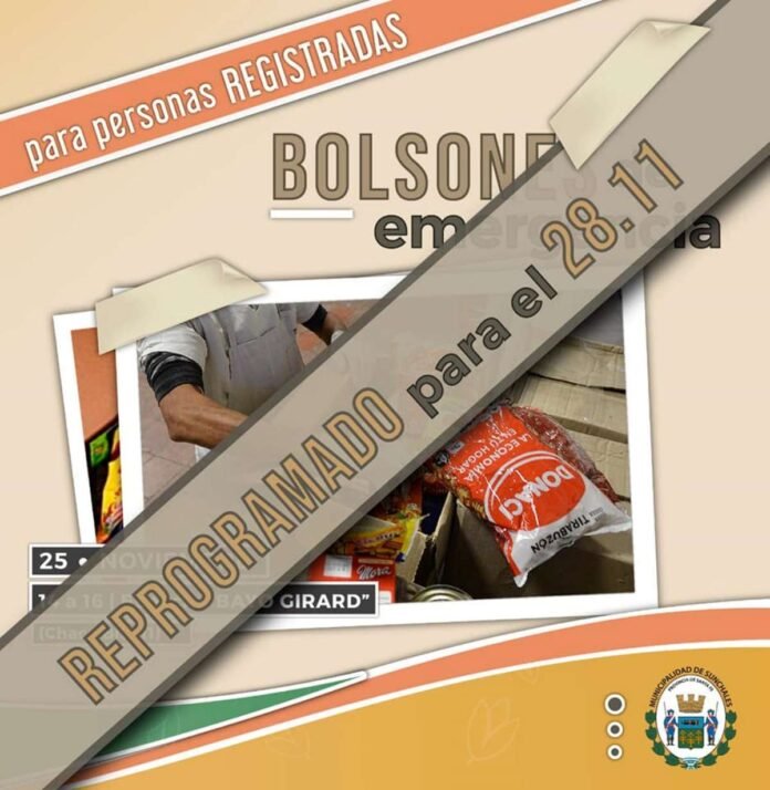 El Municipio local, mediante una publicación en su cuenta de Facebook, informó este sábado acerca de la reprogramación de la entrega de Bolsones Alimentarios y de Emergencia. Los mismos, iban a efectivizarse el viernes aunque su entrega se efectuará el lunes.