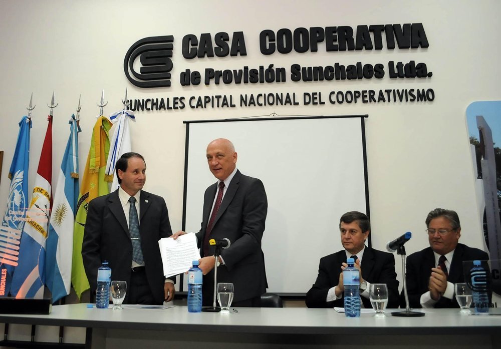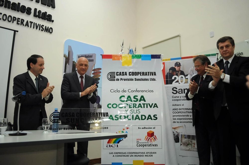 “En este año 2012, reconocido por las Naciones Unidas como el año internacional de las cooperativas, de alguna medida venimos a Sunchales, capital provincial y nacional de cooperativismo, a celebrar la organización de este Ciclo de Conferencias que indudablemente contribuirá a profundizar el conocimiento de la región sobre diversas temáticas de trabajo mancomunado. Venimos también a alentar el esfuerzo santafesino de hombres y mujeres que trabajan haciendo de la solidaridad un ejercicio cotidiano, ofreciéndole una contribución profunda al bienestar y la cohesión de nuestra sociedad. Nuestra provincia ha sido pionera del cooperativismo y de la configuración de una economía social en el país. Hace más de 110 años que en Santa Fe comenzaron a florecer las organizaciones democráticas para la producción agraria”.