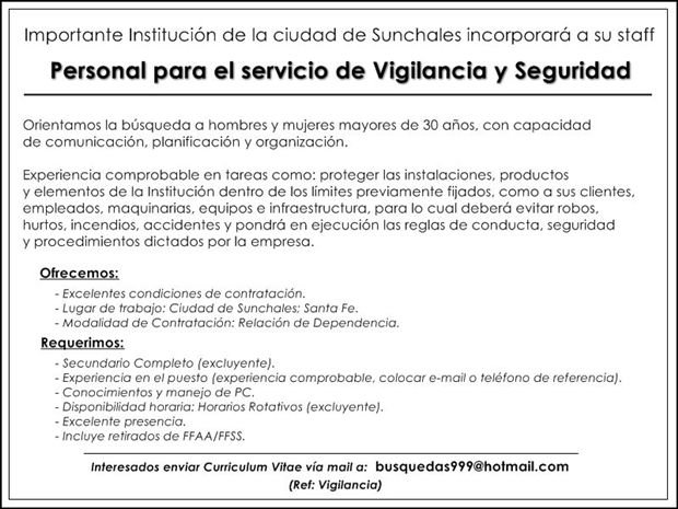 Interesados enviar Curriculum Vitae vía mail a busquedas999@hotmail.com (Ref: Vigilancia)