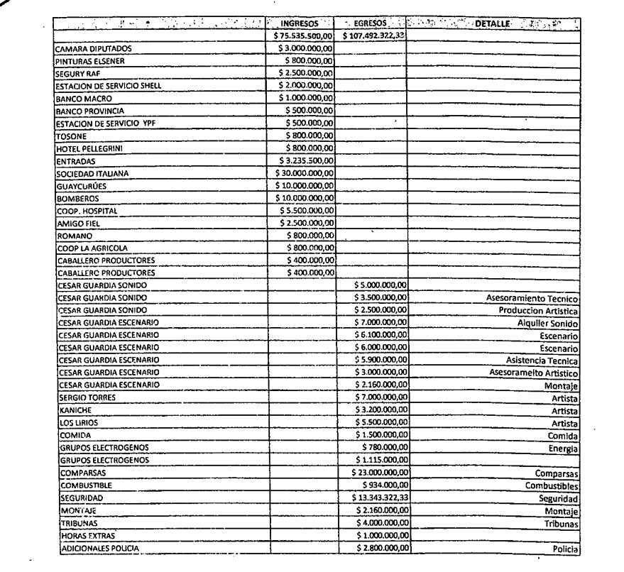 La información, que lleva la firma del subsecretario de Hacienda y Finanzas, Daniel García, detalla montos y rubros afectados. Todo se organiza en dos columnas, siendo sumamente simple la lectura: hubo Ingresos por poco más de 75,5 millones de pesos (de los cuales 58 millones fueron para Sociedad Italiana, Guaycurúes, Bomberos, Cooperadora del Hospital y Amigo Fiel. También se anunciaba la participación de Lazos, Casa del Niño y El Faro, aunque no hay mención), mientras que la organización del evento representó un Egreso de casi 107,5 millones de pesos.
