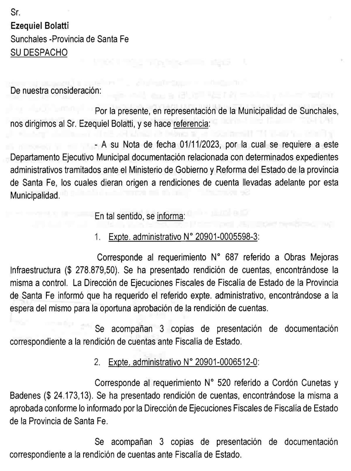 Mediante una nota, el ex Intendente Ezequiel Bolatti dio a conocer nueva información relacionada a los reclamos de rendición de Expedientes por parte de la Fiscalía de Estado. La novedad llegó a través de una respuesta que le otorgó el propio Municipio, en la cual se señala que los casos referidos a su gestión y la de Oscar Trinchieri, están presentados y justificados.