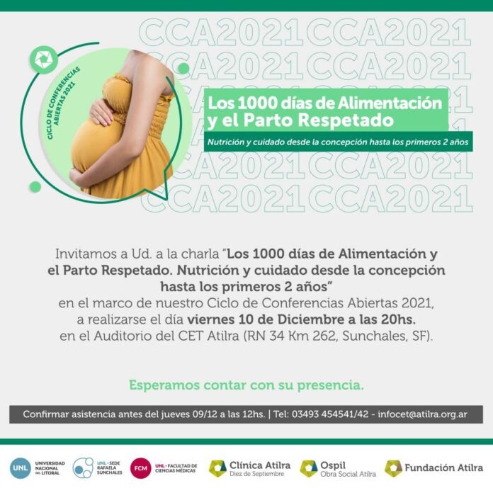 Continuando con el Ciclo de Conferencias que organiza Fundación Atilra en el Centro Educativo Tecnológico, este viernes a la hora 20 se ofrecerá un nuevo encuentro. El mismo se denomina: «Los 1000 días de Alimentación y el Parto Respetado – Nutrición y cuidado desde la concepción hasta los primeros dos años» y será llevado a cabo por la Lic. en Nutrición Jesica Díaz -especializada en Nutrición Pediátrica y Neonatal- y la Dra. Clarisa Bosco -Ginecóloga y Obstetra–, integrantes del Staff Médico de Clínica Atilra Diez De Septiembre.