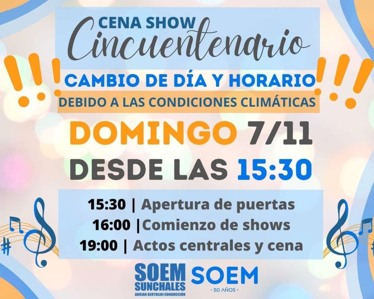 Frente a la persistencia de las condiciones climáticas adversas, el Sindicato de Obreros y Empleados Municipales resolvió posponer la Fiesta por su Cincuentenario. La misma tendrá lugar el domingo desde la hora 15.30, ganando así tiempo para poder ofrecer el predio en la mejor situación posible.