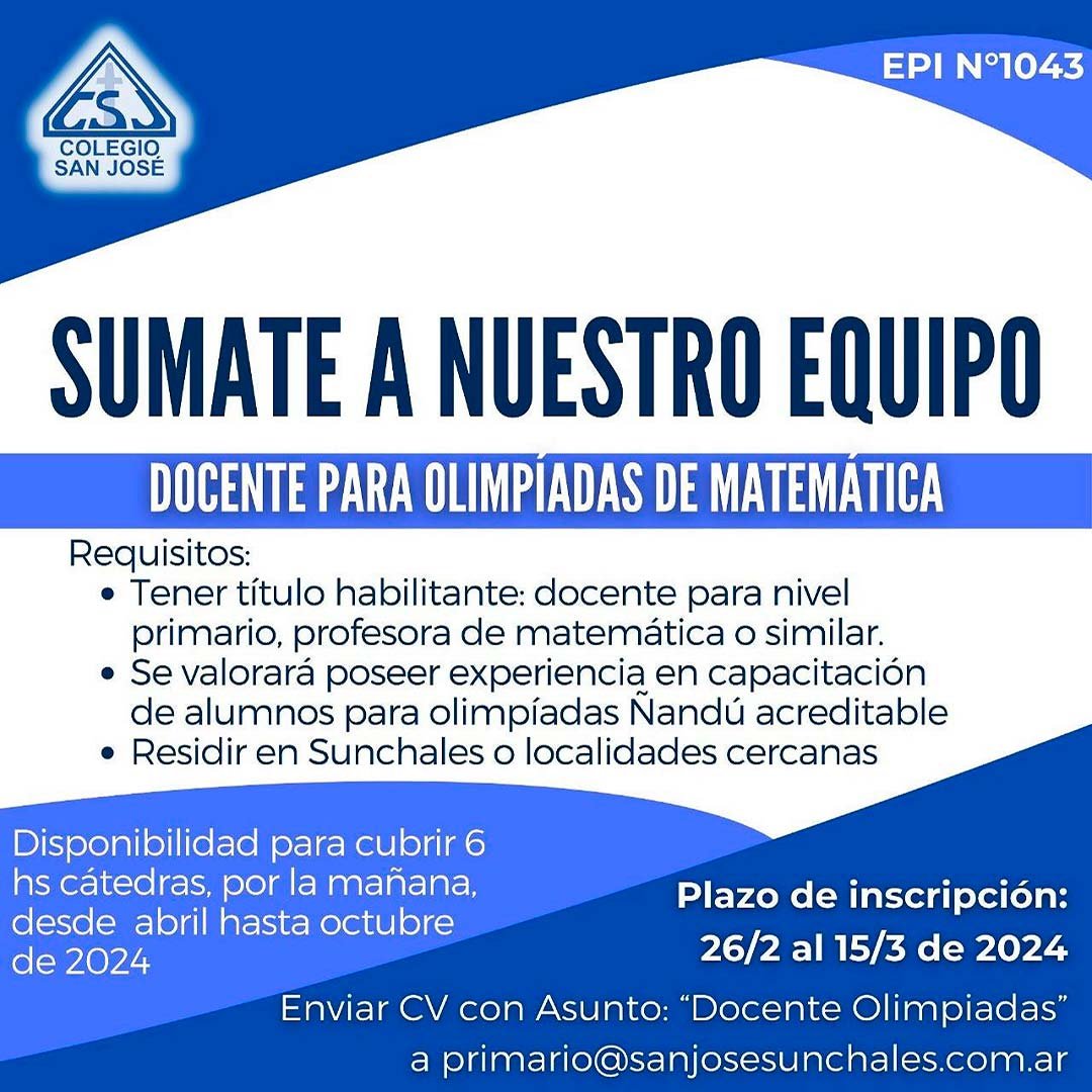El colegio «San José» se encuentra en la búsqueda de un docente de Matemáticas para poder desempeñarse en un rol muy especial tal como lo es la capacitación de alumnos para las Olimpíadas del área.
