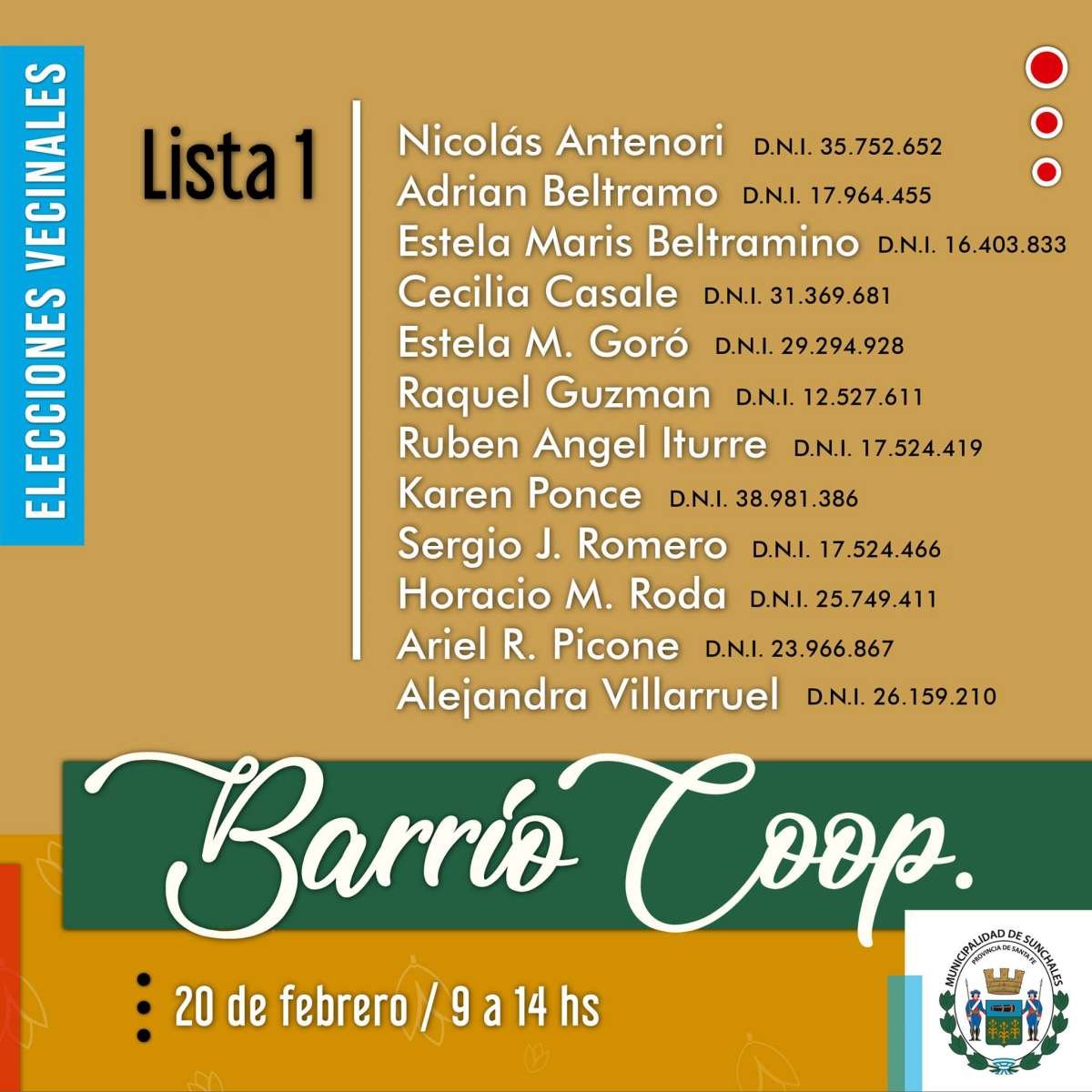 La Municipalidad de Sunchales invita a los ciudadanos a participar de las elecciones vecinales en barrios Colón, Moreno y Cooperativo el próximo sábado 20 de febrero. Los comicios se llevarán a cabo siguiendo los protocolos pertinentes en materia de seguridad sanitaria.