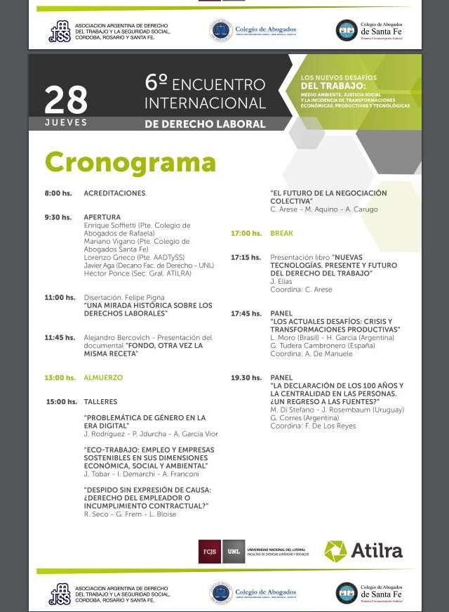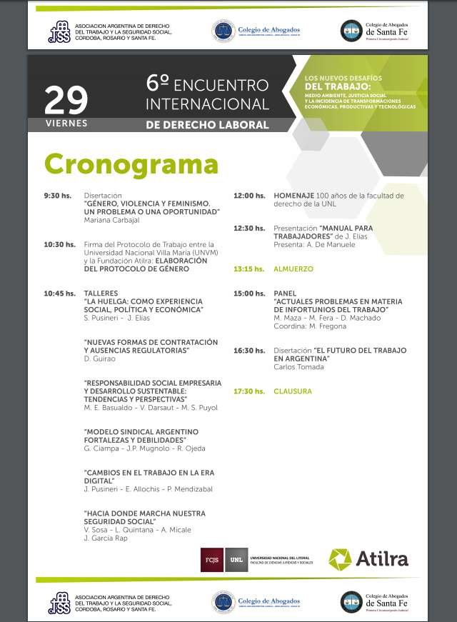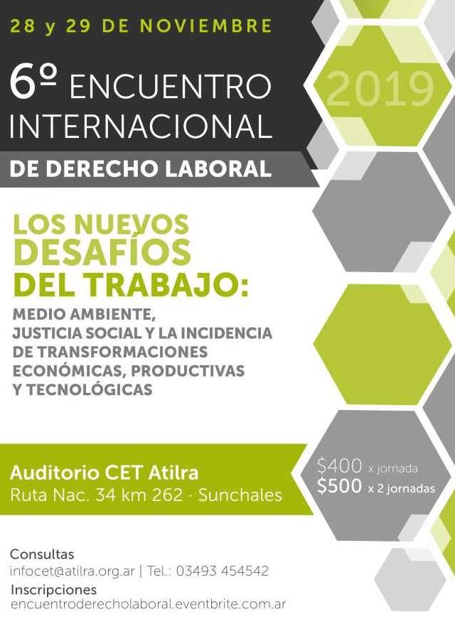 El 6° Encuentro Internacional de Derecho Laboral, organizado por Fundación Atilra y contando con la participación de importantes casas de estudios del país, recibirá a disertantes de diferentes puntos, con un alto nivel de ponencias. Aquí el detalle de lo que sucederá hoy y mañana, en donde se destacan las disertaciones orientadas a los nuevos desafíos del trabajo: medio ambiente, justicia social y la incidencia de transformaciones económicas, productivas y tecnológicas.