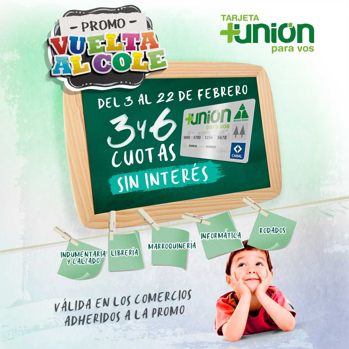 Desde hoy y hasta el 22 de febrero de 2020, tiene vigencia la PROMO ESCOLAR DE TARJETA +UNIÓN, para comprar todo lo necesario para la vuelta al cole en 3 y 6 CUOTAS SIN INTERÉS.