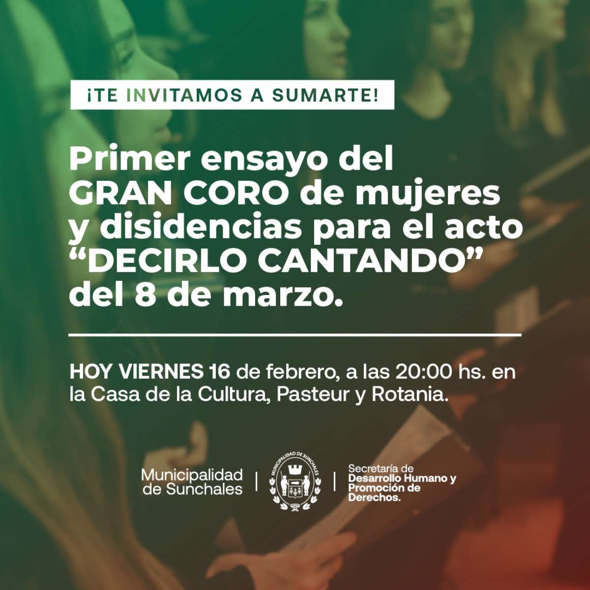 Desde el Coro Municipal se realizó una convocatoria abierta para quienes quieran sumarse a una propuesta nueva y original. Se trata de la conformación de un gran coro de mujeres y disidencias que tiene como objetivo presentarse en el acto del próximo 8 de marzo, en el marco del Día de la Mujer.