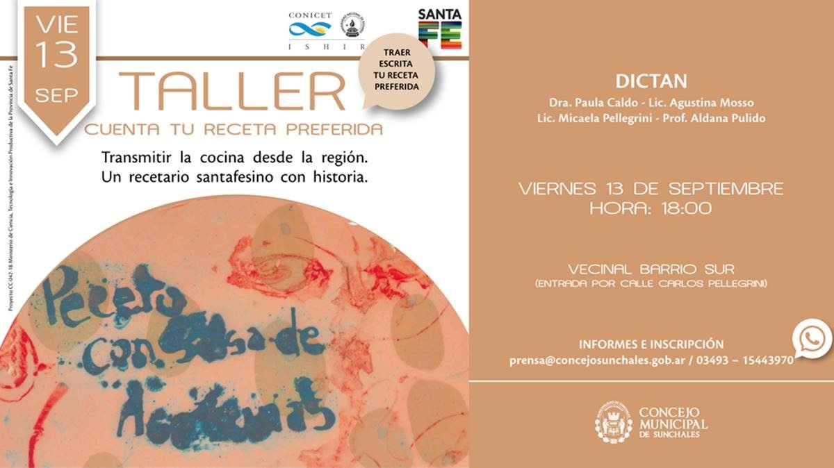 El Concejo Municipal invita a la comunidad al Taller: “Cuenta tu receta preferida”, actividad que se concretará en el marco del proyecto “Transmitir la cocina desde la región. Un recetario santafesino con historias”, el cual fue aprobado por el Ministerio de Ciencia, Tecnología e Innovación Productiva de la provincia de Santa Fe.
