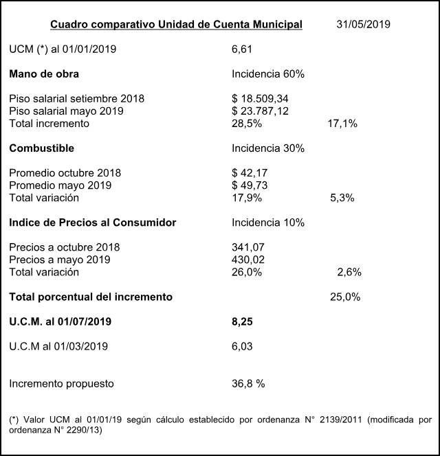 En el final de la sesión ordinaria de este jueves, los ediles darán ingreso a un pedido del Departamento Ejecutivo Municipal a través del cual se solicita una actualización de la Unidad de Cuenta Municipal. La misma, base para el cálculo de diferentes aspectos administrativos e impositivos locales, está vigente desde el primer día del presente año, por lo que la variación contempla lo acontecido en los primeros siete meses del año.