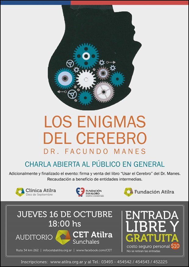 En otra de las actividades de divulgación científica llevadas a cabo de manera conjunta por la Clínica Atilra Diez de Septiembre, Fundación Atilra y la Fundación Favaloro, llegará a Sunchales uno de los científicos argentinos de mayor prestigio internacional en el campo de la neurociencia para presentar su último trabajo editorial titulado: «Usar el Cerebro» -conocer nuestra mente para vivir mejor-, editado por el sello Planeta en el mes de marzo de este año.