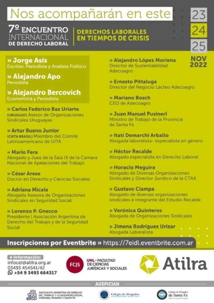 Desde Fundación Atilra se informó que los días miércoles 23, jueves 24 y viernes 25 de noviembre, en las instalaciones del Centro Educativo Tecnológico Atilra, se desarrollará el 7° Encuentro Internacional de Derecho Laboral, que organizan anualmente en conjunto con la Facultad de Ciencias Jurídicas de la Universidad Nacional del Litoral. En esta nueva edición, el mismo se titula: «Derechos laborales en tiempos de crisis».