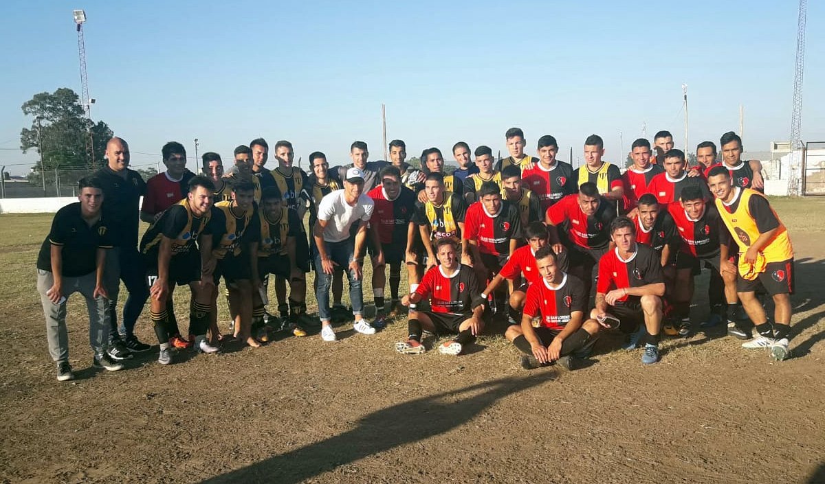 Los dos planteles posando junto al goleador internacional Lucas Alario, surgido del equipo de Tostado.