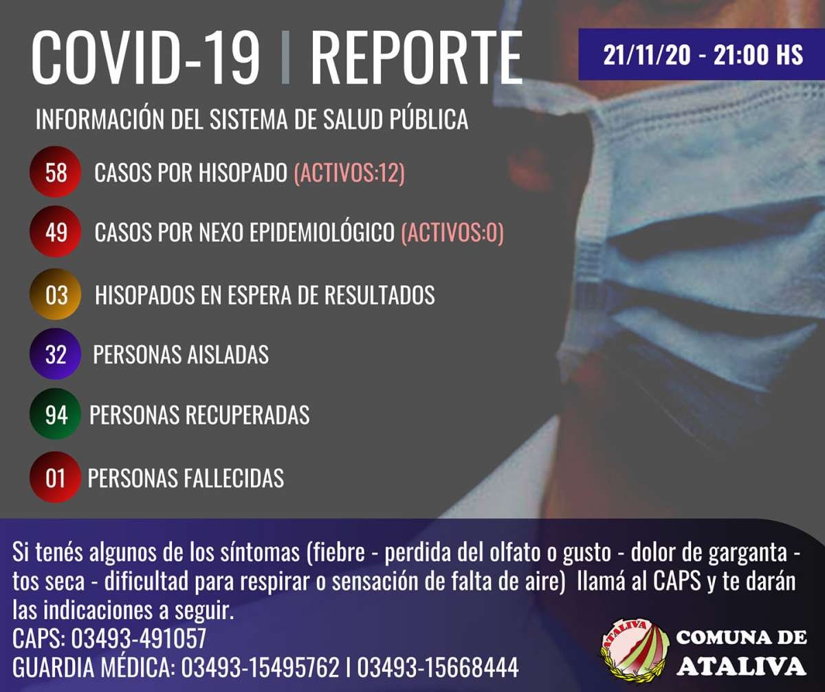 La Comuna de Ataliva dio a conocer el nuevo Reporte Epidemiológico, a través del cual confirmó que mediante hisopado ayer se detectaron cuatro nuevas personas positivas activas.
