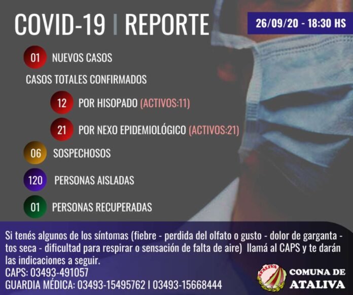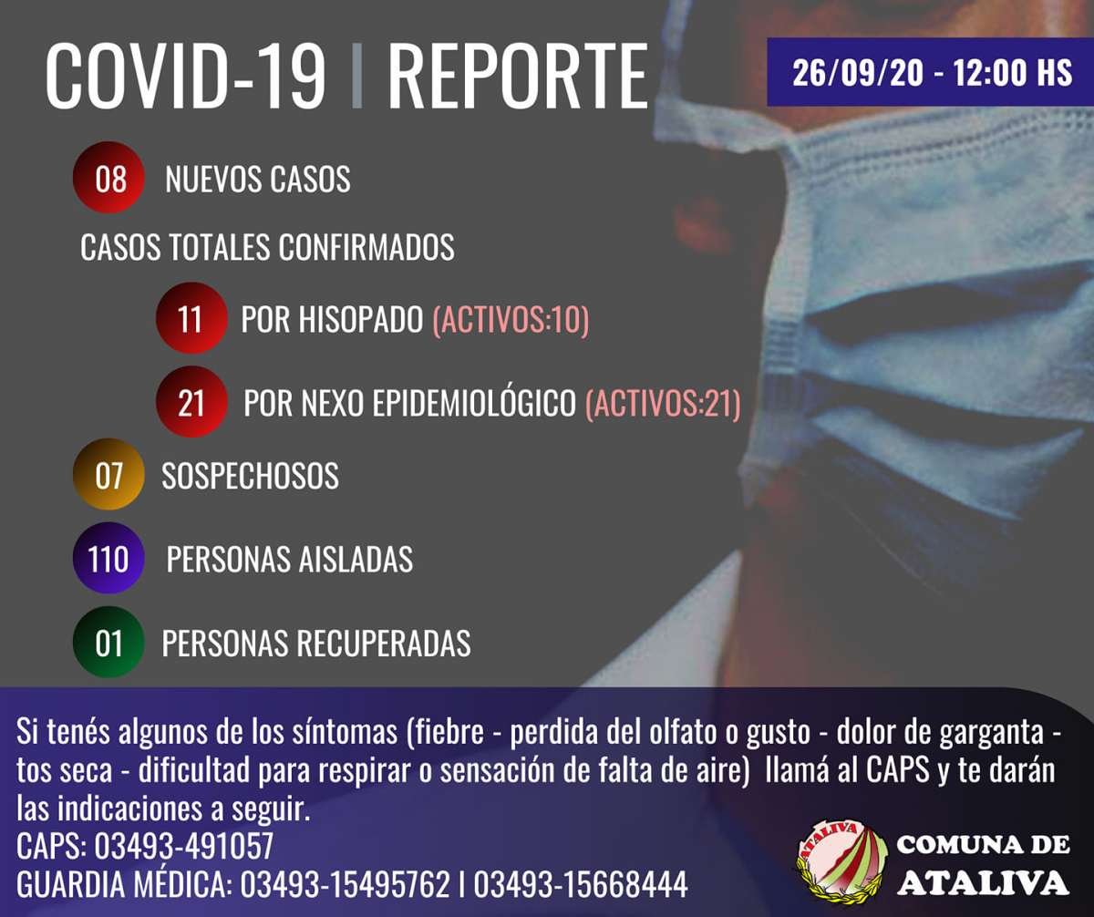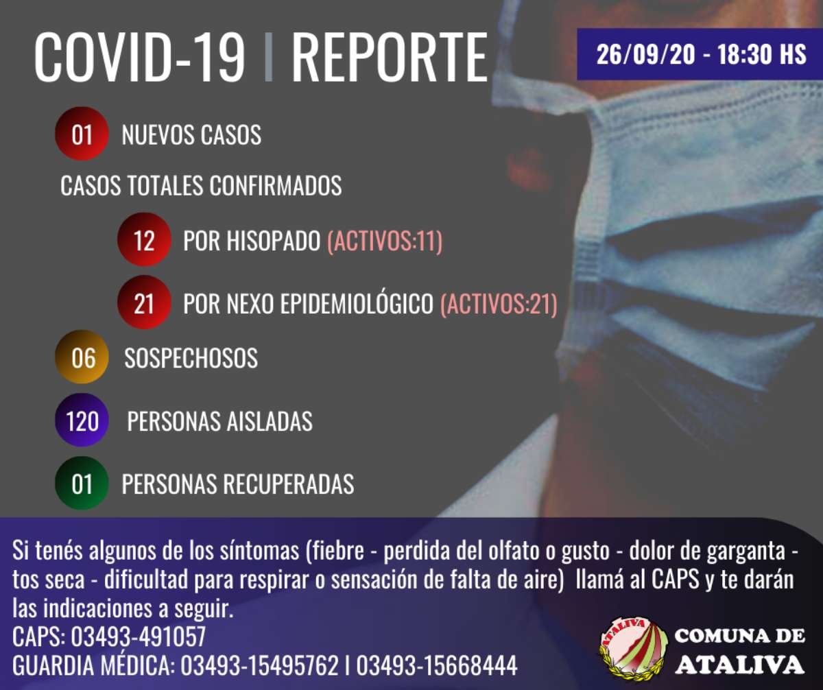 La Comuna de Ataliva emitió en la jornada de hoy dos Reportes Epidemiológicos en los cuales actualizó la situación en dicha localidad. En el primero, al mediodía, se consignaron ocho nuevos positivos, sumándose un caso más a la hora 18.30, para totalizar nueve en esta jornada.