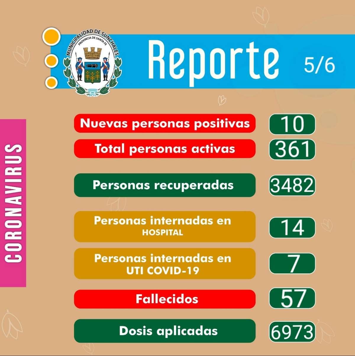 El Reporte Epidemiológico de este sábado llegó con solamente una decena de casos positivos confirmados, cifra que refleja el amesetamiento que van registrando los índices locales en esta última semana. Los casos activos suman 361 sunchalenses, con 14 internados en el hospital y 7 en Terapia Intensiva.