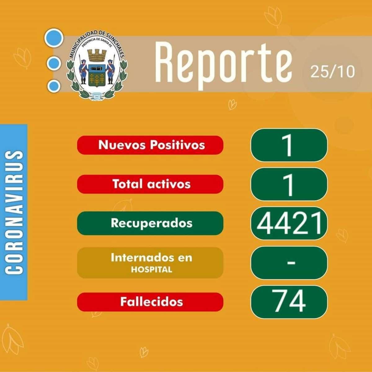 Interés general Covid19: La ciudad vuelve a tener un caso positivo 25/10/2021 Por Redacción SH 53 Compartir FacebookXWhatsAppEmail Luego de varias jornadas sin que se difundiera el Reporte Epidemiológico, hoy se retomó el mismo con un caso positivo confirmado. De esta manera, la ciudad vuelve a tener un caso activo después de varios días sin que se registre actividad. TemasCoronavirusCovid19 Compartir FacebookXWhatsAppEmail Relacionadas Covid19: Comienzan a colocar la vacuna bivalente 06/02/2023 Un año de crecimiento pero con materias pendientes 31/12/2022 Covid19: La Provincia pidió usar el barbijo en el transporte de corta y larga distancia 17/12/2022 Ultimas noticias SAT: Alerta Naranja para casi todo el lunes 05/04/2026 Vóley F – F3: Nueva victoria para las chicas de Libertad 05/04/2026 PDI Detuvo a joven sunchalense por amenazas hacia alumnos y escuelas 05/04/2026