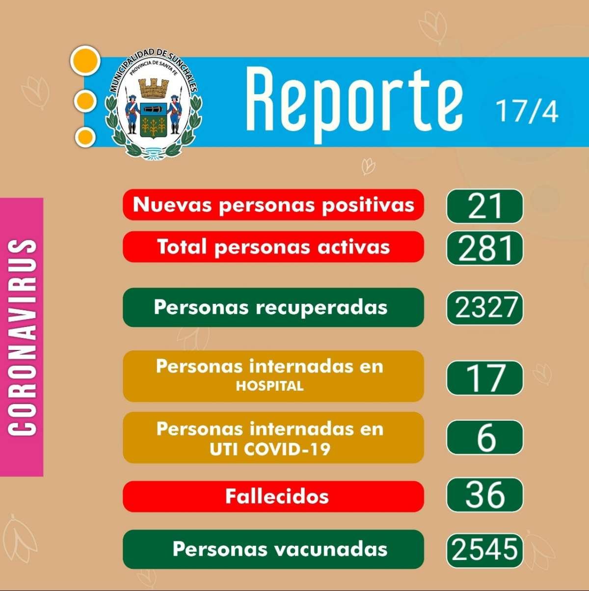 El Reporte Epidemiológico de este sábado dejó otros 21 nuevos confirmados de Covid19 en la ciudad, llevando el total de activos a 281 personas. Además, desde hoy se incorpora como información, la cantidad de personas vacunadas, siendo al día de hoy 2545 sunchalenses.