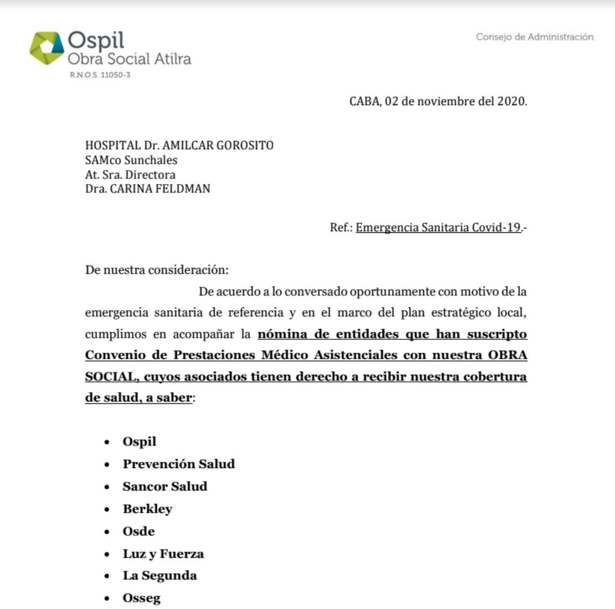 De acuerdo a lo conversado oportunamente con motivo de la emergencia sanitaria de referencia y en el marco del plan estratégico local, cumplimos en acompañar la nómina de entidades que han suscripto Convenio de Prestaciones Médico Asistenciales con nuestra OBRA SOCIAL, cuyos asociados tienen derecho a recibir nuestra cobertura de salud, a saber:
