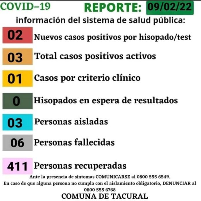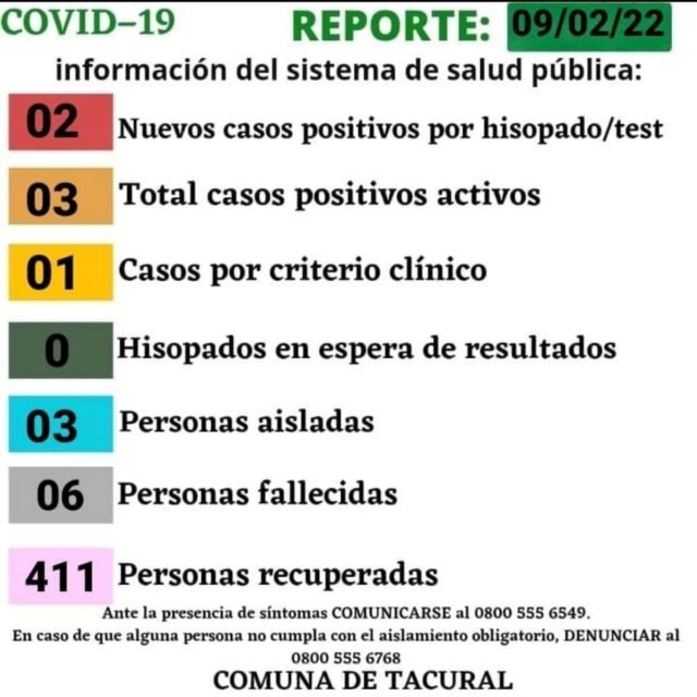 RegiónTacural Covid19: Tacural actualizó su situación epidemiológica 10/02/2022 Por Redacción SH 34 Compartir FacebookXWhatsAppEmail La Comuna de Tacural informó la detección de dos nuevos casos positivos de Covid19 mediante hisopado, más un tercero por criterio clínico epidemiológico, para así tener tres casos activos, con otras tantas personas aisladas. TemasCoronavirusCovid19Tacural Compartir FacebookXWhatsAppEmail Relacionadas LRF – F9: Libertad se reencontró con el triunfo 17/05/2025 Sunchalote: Concesionaron el servicio de electricidad a la Cooperativa de Tacural 30/11/2024 Recuperan en Sunchales, canoa robada en Tacural 07/09/2024 Ultimas noticias LRF – F3: Libertad juega mañana al mediodía 28/03/2026 ARB F – F3: Unión frenó a San Lorenzo 28/03/2026 ARB F – F3: Ajustada derrota de Libertad 28/03/2026