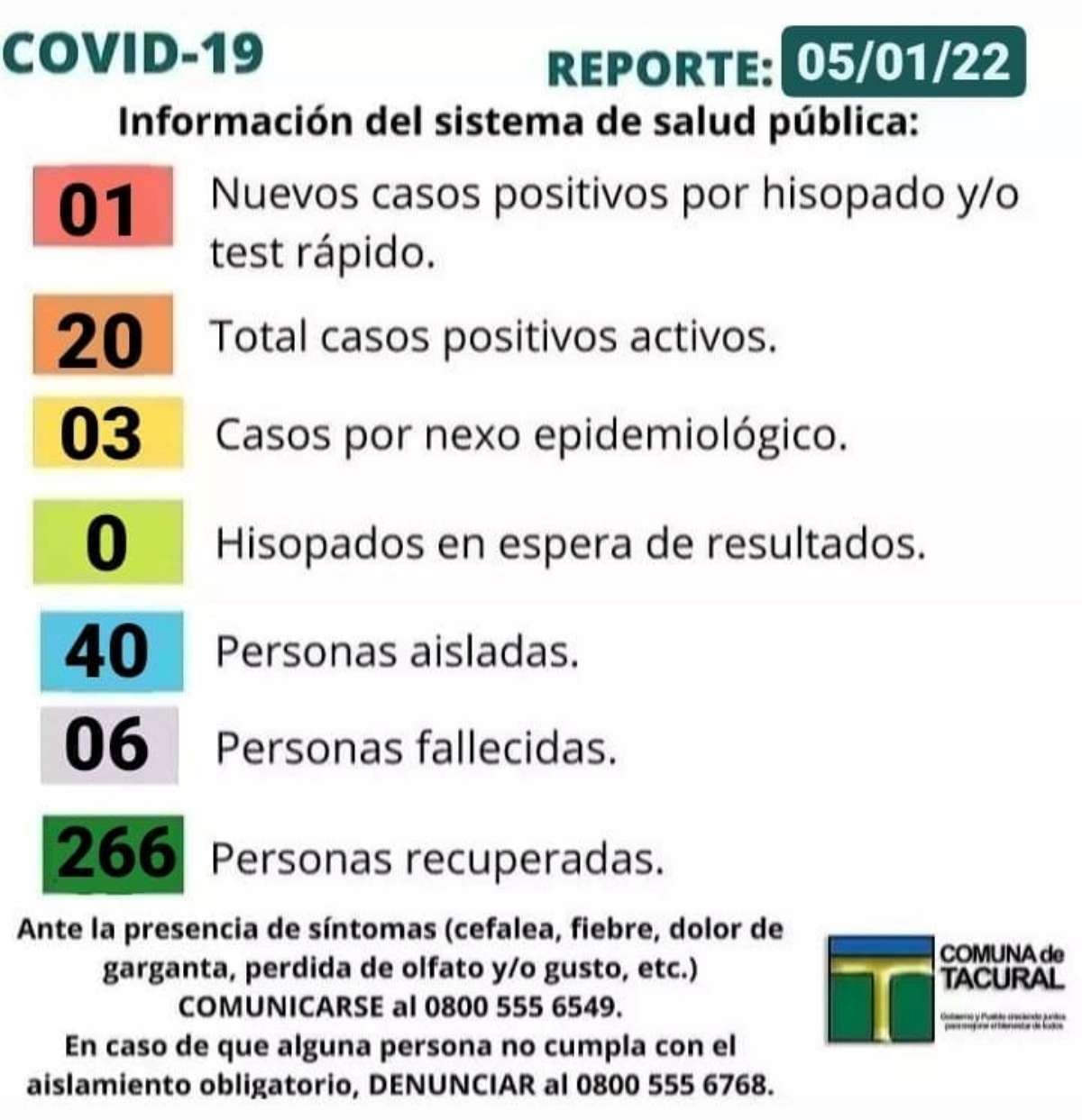 La Comuna de Tacural informó un nuevo caso positivo de Covid19. De esta manera, se acumulan veinte casos activos en estos momentos, sin que haya resultados pendientes. Además, suman 40 las personas aisladas.