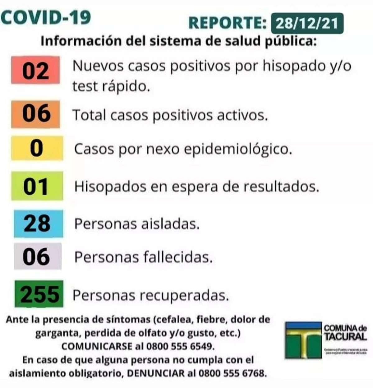 RegiónTacural Covid19: Tacural confirmó dos nuevos positivos 29/12/2021 Por Redacción SH 26 Compartir FacebookXWhatsAppEmail La Comuna de Tacural dio a conocer su nuevo Reporte Epidemiológico a través del cual confirmó dos nuevos casos positivos de Covid19. Al mismo tiempo, se registraron dos altas por lo que siguen siendo seis los casos activos. TemasCoronavirusCovid19Tacural Compartir FacebookXWhatsAppEmail Relacionadas LRF – F9: Libertad se reencontró con el triunfo 17/05/2025 Sunchalote: Concesionaron el servicio de electricidad a la Cooperativa de Tacural 30/11/2024 Recuperan en Sunchales, canoa robada en Tacural 07/09/2024 Ultimas noticias A 92 años de la educación Técnica 02/04/2026 A 78 años del nacimiento del club Atlético Unión 02/04/2026 A 118 años del colegio «San José» 01/04/2026