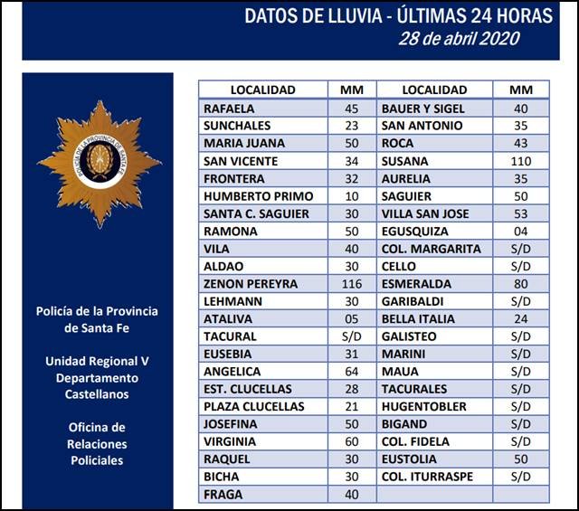 Región Datos de lluvia de las últimas 24 horas 28/04/2020 Por Redacción SH 1727 Compartir FacebookXWhatsAppEmail Desde el área de Relaciones Institucionales de la Unidad Regional V de Policía remitieron el registro de precipitaciones que se han tomado en las últimas 24 horas para las diferentes localidades del Departamento. TemasDatos de precipitacionespronóstico Compartir FacebookXWhatsAppEmail Relacionadas SAT: Alerta por lluvias para el martes 15/03/2026 SAT: Anticipan tormentas para la tarde de hoy 08/03/2026 SAT: Alerta Amarillo por tormentas para el martes 01/03/2026 Ultimas noticias Ruta 34: Alerta por daños en la zona de la alcantarilla reparada 15/04/2026 Bochas: Destacada participación de la escuelita del Belgrano en San Guillermo 15/04/2026 ARB Formativas – F4: Actividad para los equipos de Unión 15/04/2026
