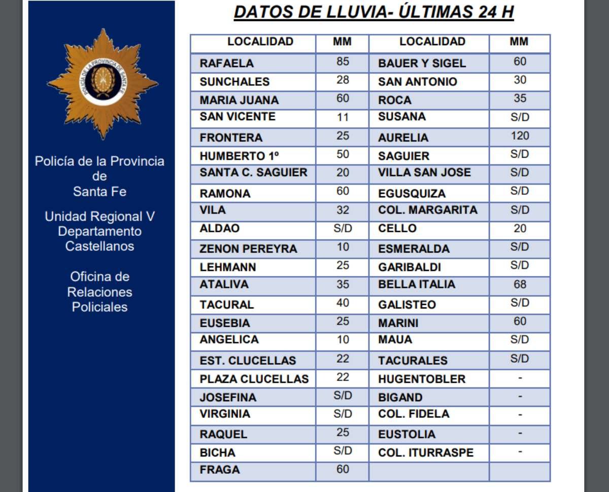 La Oficina de Relaciones Institucionales de la Unidad Regional V de Policía remitió el resumen de los registros de precipitaciones que se dieron en el Departamento en la jornada de ayer martes.