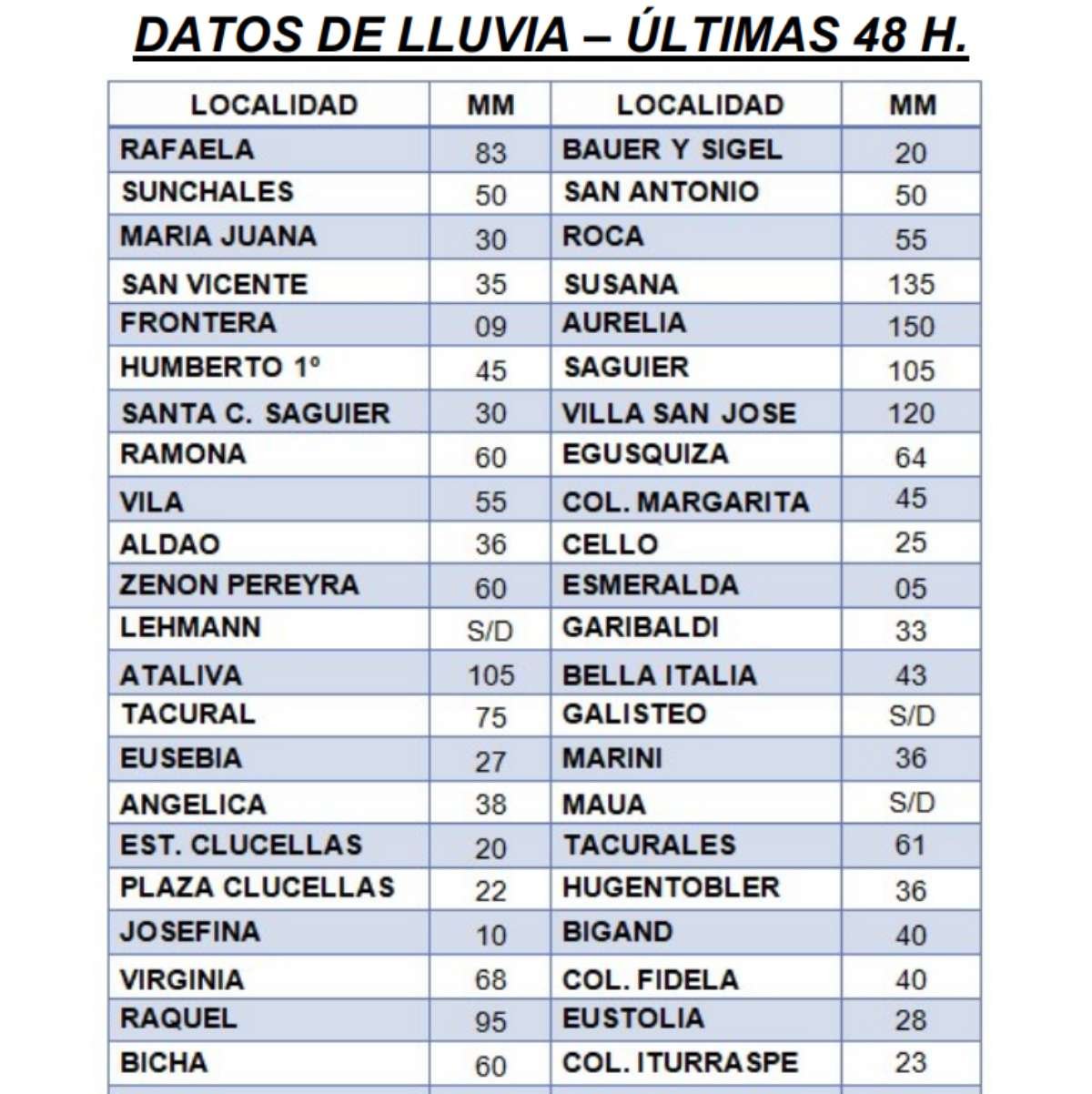 Región Datos de lluvia del Departamento 30/11/2020 Por Redacción SH 348 Compartir FacebookTwitterWhatsAppEmail Con la colaboración de la Unidad Regional V de Policía, se realizó como habitualmente, el repaso de las precipitaciones que se registraron a lo largo del fin de semana en las localidades del Departamento Castellanos. Aquí, el informe difundido. Temasdatos de lluviaprecipitaciones Compartir FacebookTwitterWhatsAppEmail Relacionadas SAT: Alerta Temprana por tormentas para el jueves 15/10/2024 Las lluvias continúan y empiezan a reflejarse en el acumulado 10/01/2024 Datos de lluvia de la jornada de ayer en el Departamento 25/03/2022 Ultimas noticias A 11 años del «Paseo de las Artes» 07/03/2026 A 49 años de la escuela N° 2054 «Alas para la Vida» 07/03/2026 AMB – F1: Libertad comenzó ganando ante 9 de Julio de Morteros 07/03/2026