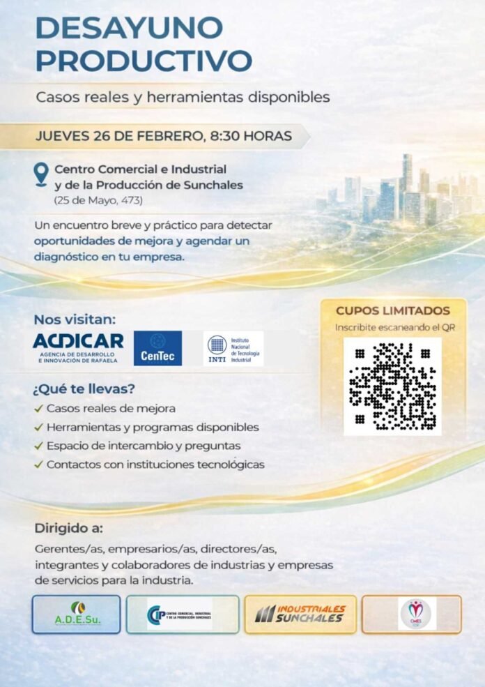 Bajo la organización de Adesu, Centro Comercial, Industriales y la Cámara de Mujeres Empresarias, este jueves desde las 8.30 (en el salón del Centro Comercial), tendrá lugar un Desayuno Productivo.
