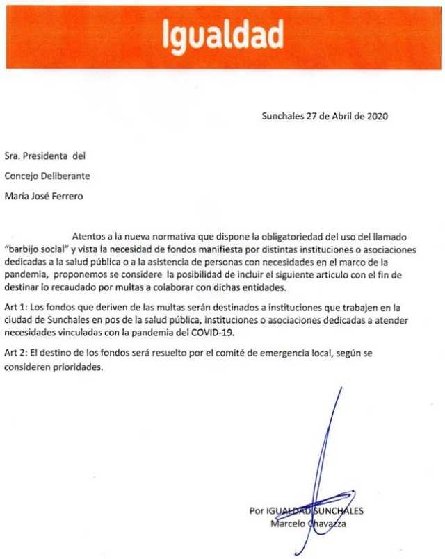A través de una nota elevada al Concejo, los representantes locales de Igualdad Sunchales solicitaron que los fondos que se generen a partir del cobro de multas por la no utilización del «Barbijo Social», sean destinados a la atención de la salud sunchalense.