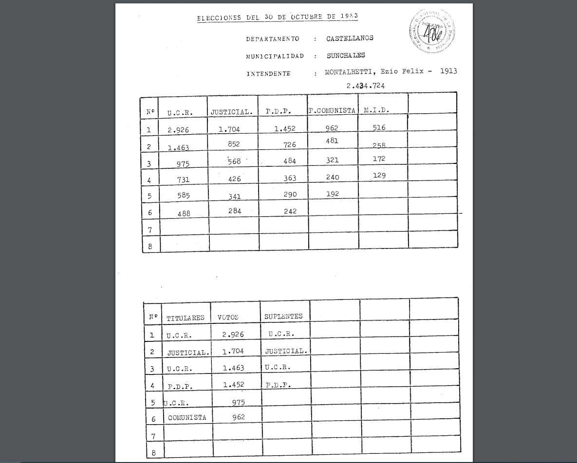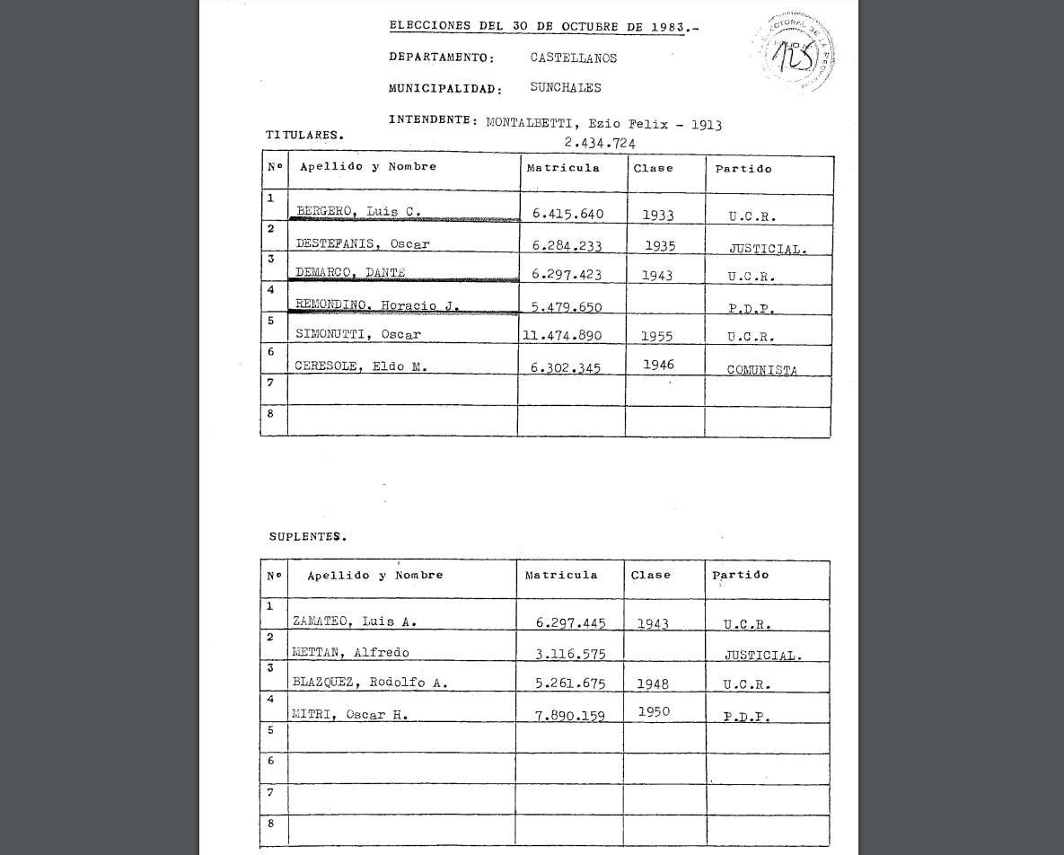 Luego del recuento de sufragios, se estableció que el escribano Ezio Montalbetti fuera el Intendente, acompañado por el Dr. Emilio Ingaramo en el Congreso de la Nación al ser electo como Diputado Nacional por nuestra provincia de Santa Fe. A su vez, el Concejo tenía como Presidente a don Luis Bergero, quien estaba acompañado por: Oscar Destéfanis, Dante Demarco, Horacio Remondino, Oscar Simonutti y Eldo Ceresole.