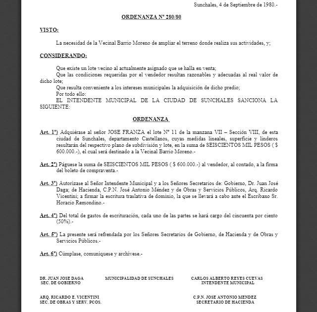 Durante el transcurso de la década del ’70 se logró que la Municipalidad adquiriera un lote baldío en el cual luego proyectar la construcción de la sede vecinal. Carlos Reyes Cuevas era quien ocupaba la intendencia, incorporándose luego en 1980 un segundo terreno, aledaño al primero.