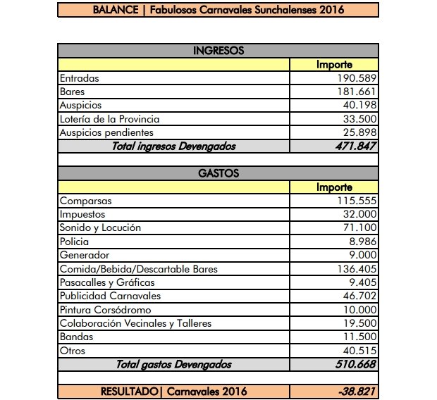 La edición 2016 de los Fabulosos Carnavales Sunchalenses arrojó casi 40 mil pesos de pérdida. Así se puede advertir tras la realización del Balance de los mismos que ha realizado el municipio. En líneas generales, no es una cifra altamente significativa y se enmarca dentro de las previsiones generales.