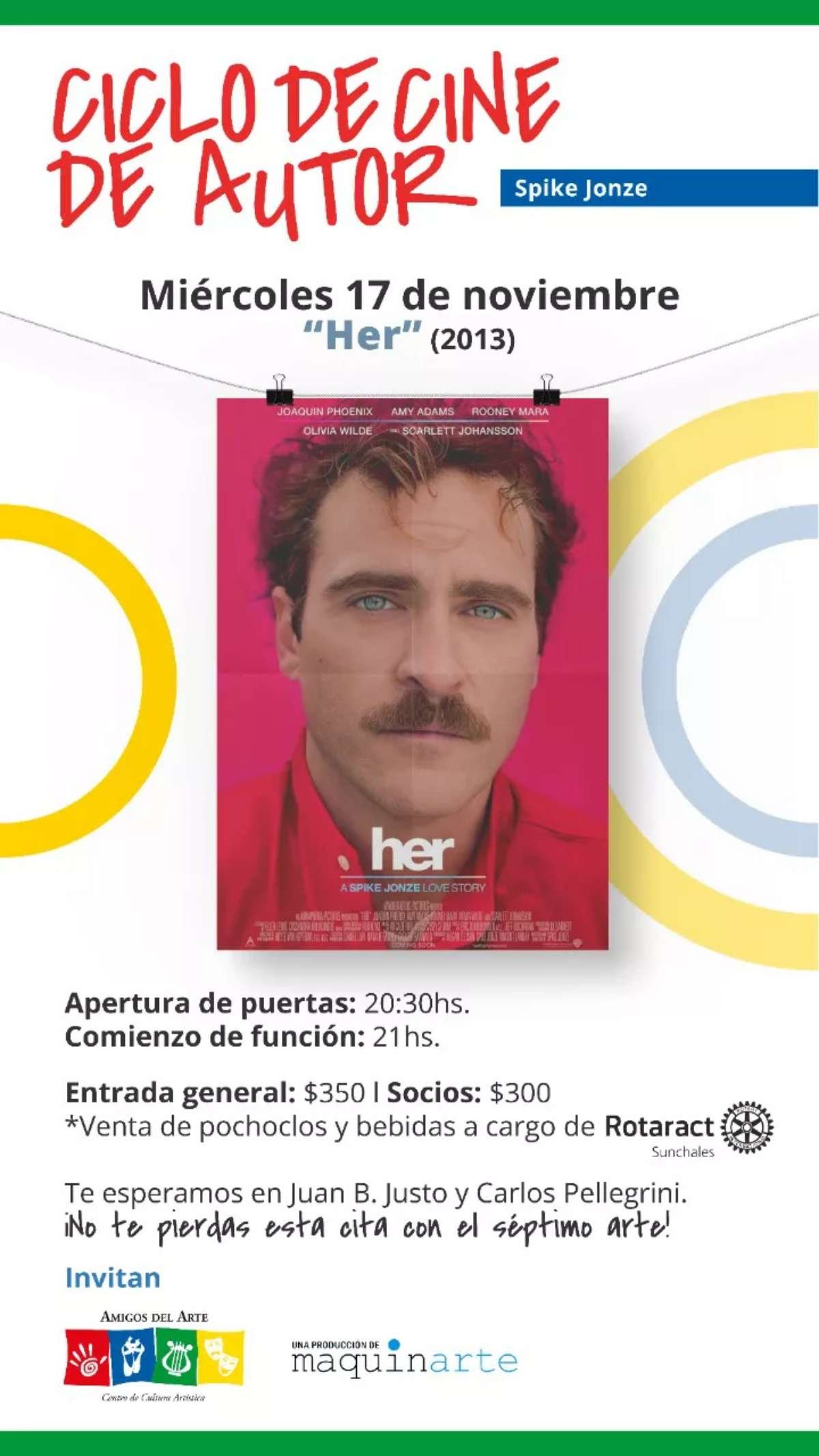 El Centro de Cultura Artística “Amigos del Arte” continúa recorriendo, junto a la agrupación MaquinAarte, una selección de películas de aclamados directores de diversas nacionalidades, extendiendo esta actividad a partir de la buena recepción de parte del público.