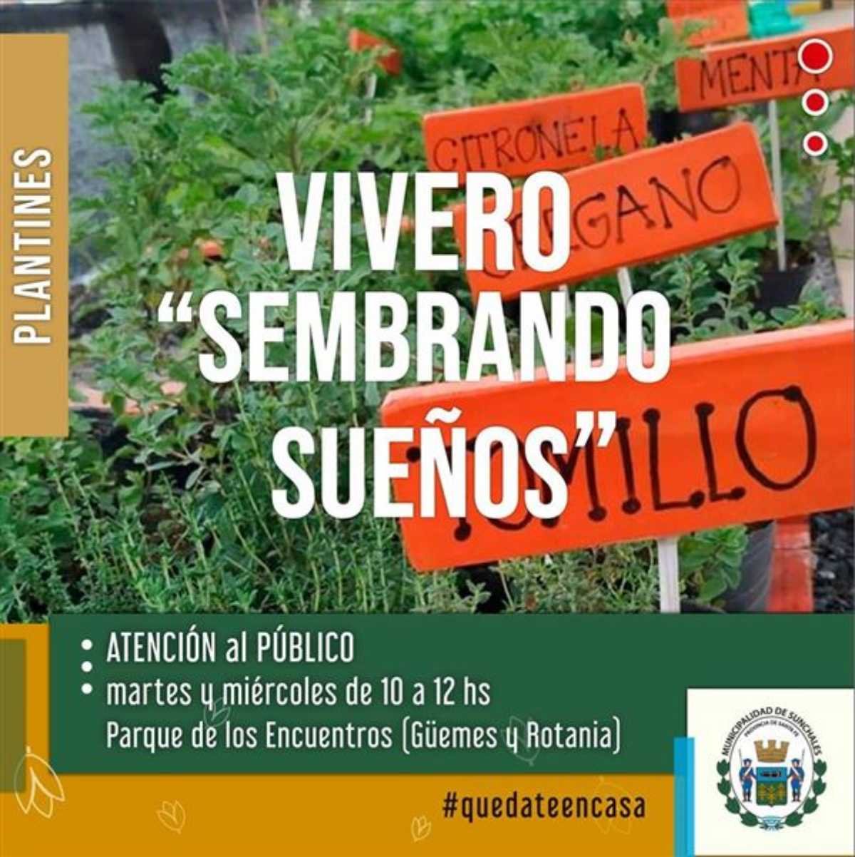 El Vivero Municipal “Sembrando Sueños” recuerda que está abierta la atención al público los días martes y miércoles en el horario de 10 a 12 horas. El mismo, funciona en Parque de los Encuentros (Güemes y Rotania), pudiéndose los interesados acercarse a dicho lugar para poder adquirir múltiples variedades de su producción.