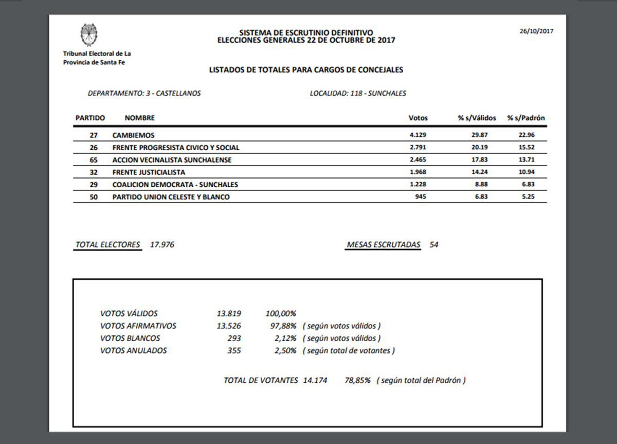 En el transcurso de la pasada semana, se conocieron los resultados finales de las Elecciones Generales. El escrutinio definitivo no modificó en demasía el escenario sunchalense pero sí permite oficializar los resultados y conocer cuántos votos recibió cada una de las fuerzas. Los votos en blanco y anulados representaron menos del cinco por ciento.