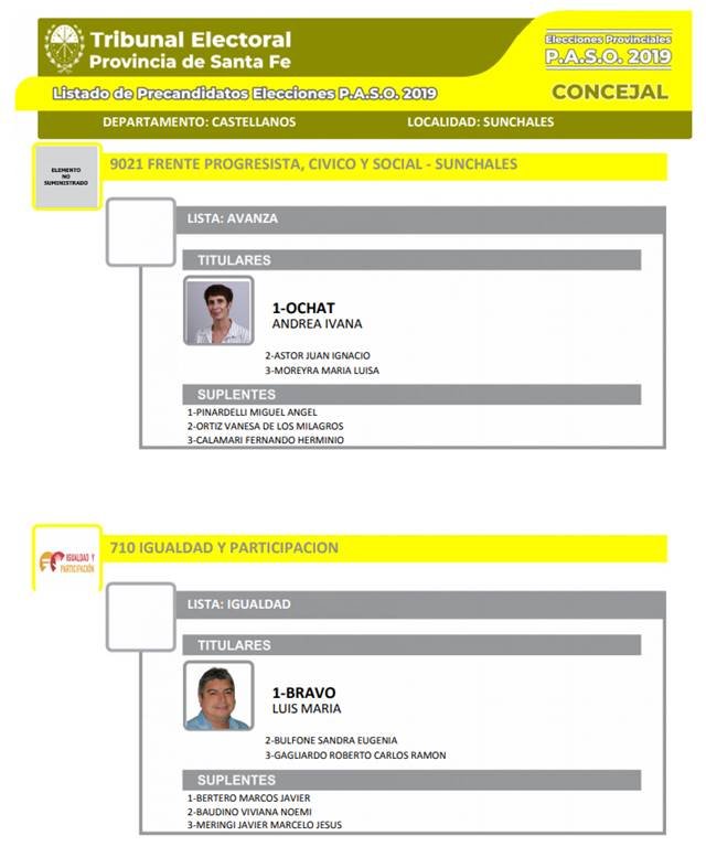 En lo que respecta a Concejales, también hay dos nóminas que deberán definir su conformación definitiva: El Frente Progresista, con la actual secretaria de Gobierno Fabrina Girard a la cabeza ante Andrea Ochat, quien preside el Concejo; y luego harán lo propio dentro del Justicialismo, las listas encabezadas por el actual concejal Fernando Cattaneo y la de José Capelino, otra de las caras nuevas en la arena política.