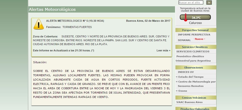 Pronóstico Emiten Alerta Meteorológico 02/03/2017 Por Material de Internet 171 Compartir FacebookXWhatsAppEmail Temaspronósticoservicio meteorológico nacionalSMN Compartir FacebookXWhatsAppEmail Relacionadas SAT: Alerta Naranja para casi todo el lunes 05/04/2026 SAT: Alerta por lluvias para el martes 15/03/2026 SAT: Anticipan tormentas para la tarde de hoy 08/03/2026 Ultimas noticias LRF Senior – F1: Libertad comenzó con goleada 11/04/2026 ARB F – F4: Clásico suspendido 11/04/2026 ARB – F4: Unión cayó en Rafaela 11/04/2026