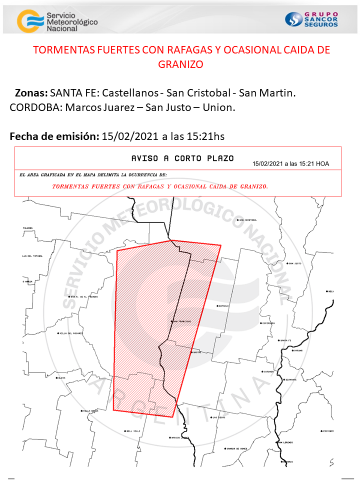 El Servicio Meteorológico Nacional emitió un Alerta a corto plazo para nuestro Departamento, así como el distrito San Cristóbal y San Martín, ante la posible ocurrencia de tormentas fuertes, con ráfagas y ocasional caída de granizo, además de fuertes precipitaciones.