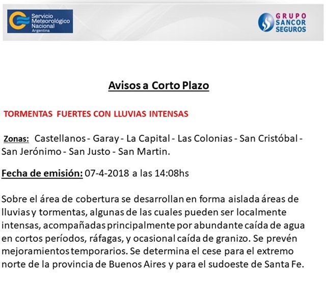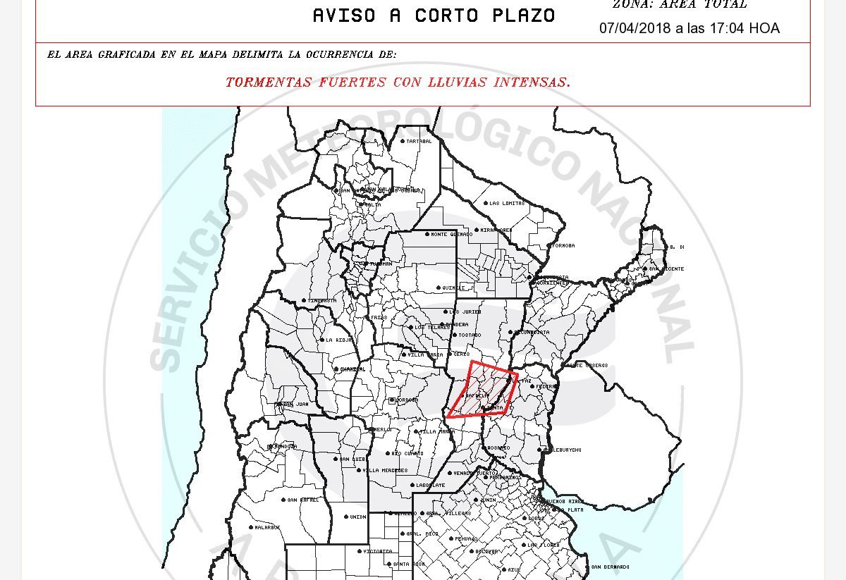 Pronóstico Emiten Alerta Meteorológico por abundantes precipitaciones 07/04/2018 Por Redacción SH 437 Compartir FacebookXWhatsAppEmail Temasalerta meteorológicopronósticoSMN Compartir FacebookXWhatsAppEmail Relacionadas SAT: Alerta Naranja para casi todo el lunes 05/04/2026 SAT: Alerta por lluvias para el martes 15/03/2026 SAT: Anticipan tormentas para la tarde de hoy 08/03/2026 Ultimas noticias SAT: Otra semana con posibles tormentas fuertes 12/04/2026 LRF – F4: Unión fue el gran ganador de la tarde 12/04/2026 Box: Derrota de Orecchia en La Pampa 12/04/2026