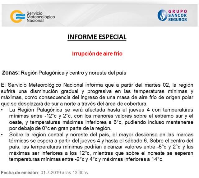 Pronóstico Emiten informe meteorológico especial por la presencia de una ola de frío 01/07/2019 Por Redacción SH 1162 Compartir FacebookXWhatsAppEmail Desde la Estación Meteorológica que funciona en el aeródromo de nuestra ciudad se emitió un informe especial a través del cual anticipan la irrupción de una masa de aire frío que ocasionaría una notable baja en las temperaturas. Temaspronósticoservicio meteorológico nacionalSMN Compartir FacebookXWhatsAppEmail Relacionadas SAT: Alerta Naranja para las próximas horas 14/04/2026 SAT: Alerta Naranja para casi todo el lunes 05/04/2026 SAT: Alerta por lluvias para el martes 15/03/2026 Ultimas noticias Escajadillo y Calvo se reunieron con Bomberos de Sunchales 20/04/2026 Nueva reunión del Consejo Ejecutivo de Seguridad 20/04/2026 ARB F – F5: Libertad no pudo con Alma Juniors 20/04/2026