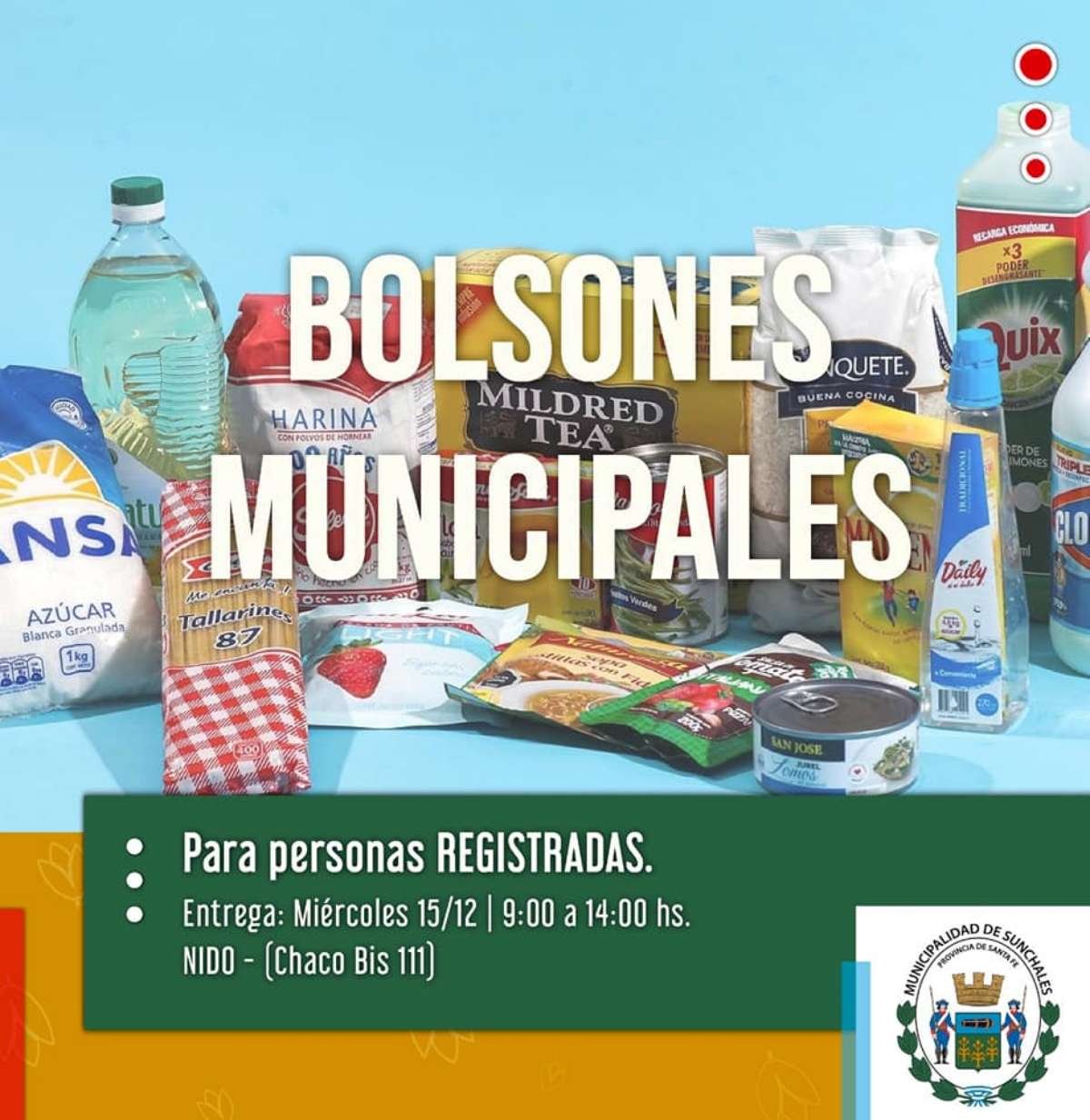 La Municipalidad comunica a los beneficiarios de los bolsones alimentarios que la entrega correspondiente al mes de diciembre, se realizará el miércoles 15 de 9 a 14, en el Núcleo de Innovación y Desarrollo de Oportunidades «Oscar Girard», ubicado en Chaco Bis 111.