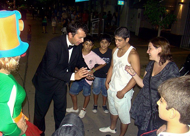 Un mago y un payaso, haciendo un show itinerante para los ocasionales transeúntes.