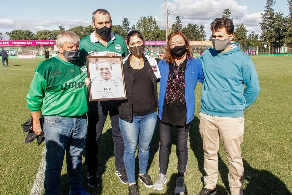 Antes de iniciarse el partido, referentes de la institución albiverde hicieron entrega de un presente a la familia de «Tato» Delbino, quien falleciera recientemente, dejando inmensos recuerdos de su paso por la dirigencia de la entidad de avenida Belgrano.