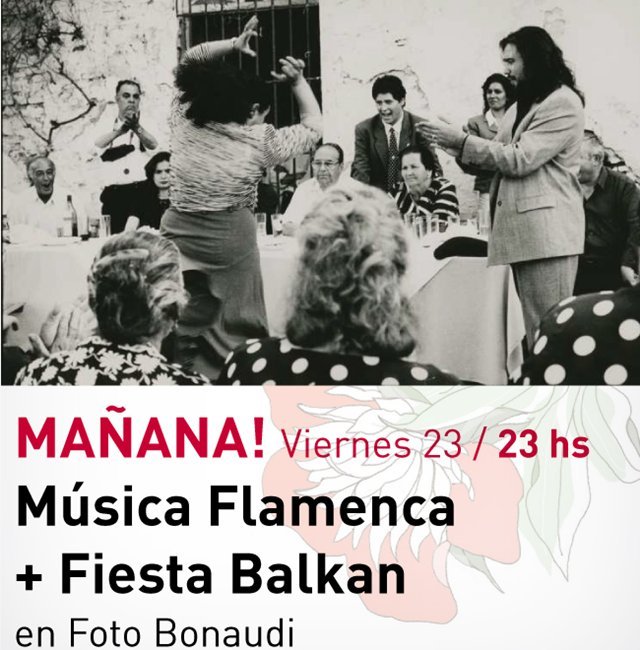 El afiche de la convocatoria al evento.La invitación es para hoy viernes, en Casa Bonaudi. Allí, a partir de la hora 23, se desarrollará una Fiesta Flamenca, junto a una Fiesta Balkan y una muestra de fotografías.