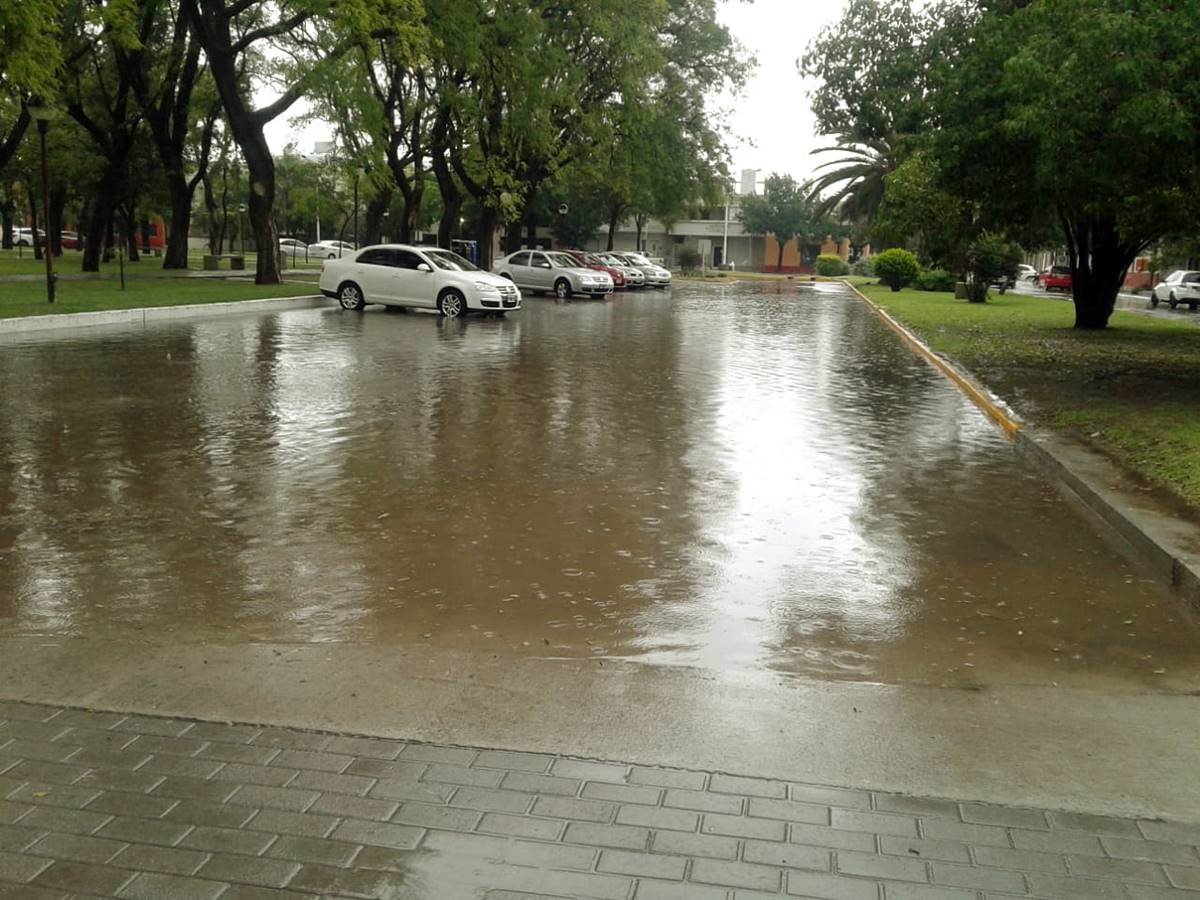 El frente del Palacio Municipal, anegado tras las imponentes lluvias del mediodía.
