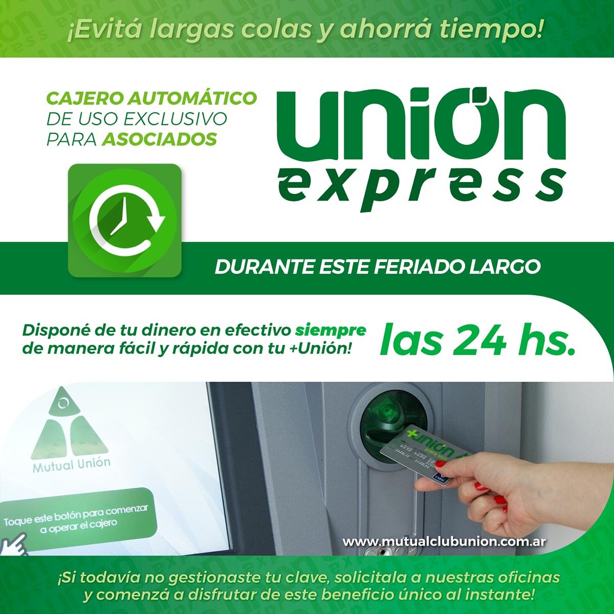 Mutual Unión recuerda que durante este feriado largo sus asociados podrán realizar retiros o depósitos de efectivo mediante el cajero automático Unión Express.
