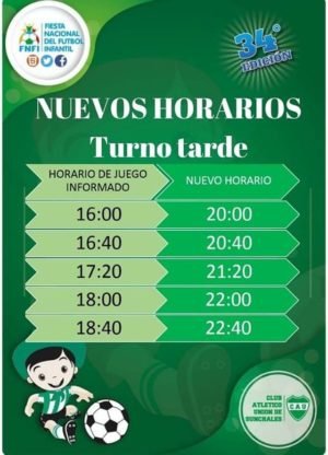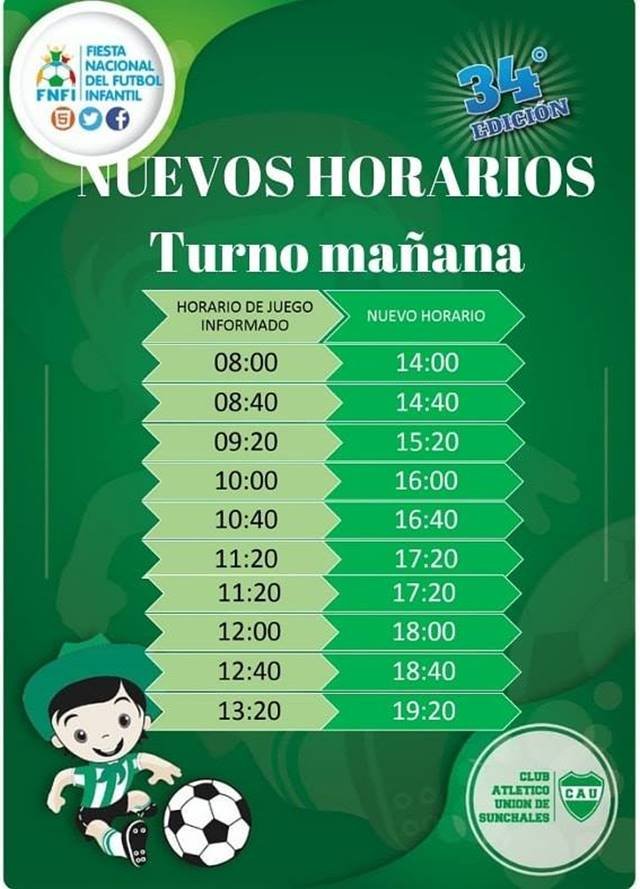 Los inoportunos 15 milímetros caídos en la mañana de hoy obligaron a los organizadores de la 34° Fiesta Nacional del Fútbol Infantil a la reprogramación de los partidos, los cuales se ponen en marcha en la tarde. También se postergó el acto inaugural de la noche de hoy viernes.